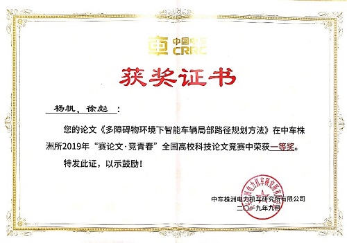 2019年9月27日,“赛论文 竞青春”全国高校科技论文竞赛在长沙举行颁奖仪式。3003新葡的京集团网址智能车辆团队研究生杨帆的论文《多障碍物环境下智能车辆局部路径规划方法》荣获一等奖。该论文结合曲线拟合与图搜索算法,为结构化道路中、多障碍物场景下智能车辆路径规划提出了新方法,具有较高的工程应用价值。