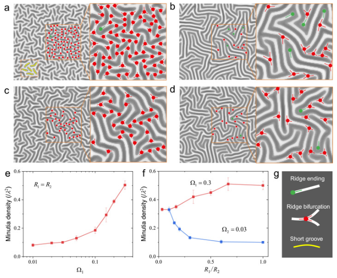 随着载荷增加,表面形貌最终演化为迷宫状失稳形貌。迷宫失稳形貌与指纹类似,是独一无二且不可复制的。在模拟中或前人的实验中没有任何两个迷宫形貌是完全相同的。这种独一无二的性质使得迷宫形貌成为了一种有前景的防伪策略。与指纹类似,迷宫形貌存在大量的细节点,比如终结点、分叉点、短沟回等,这些大量、无规则的细节点组成了独一无二的迷宫。细节点的密度是衡量防伪等级的一个重要指标。研究发现,曲率的大小及各向异性程度很大程度上决定了迷宫形貌细节点的密度,因此可以通过调控系统的曲率对迷宫形貌的防伪等级进行调控(图2)。该工作系统研究了曲率对表面失稳形貌演化的影响,不仅有助于理解自然界中曲面系统形貌形成的机理,也可应用于一些功能表面或器件的设计。