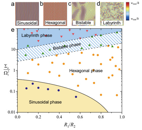 基于之前的研究工作(JMPS 2014, 73, 212-227; Soft Matter 2016, 12, 7977-7982),赵岩副教授、姜潮教授与清华大学曹艳平教授、冯西桥教授在浅壳理论的基础上建立了适用于一般曲面软材料系统表面失稳的控制方程,系统研究了曲率对表面失稳的影响,并发展了傅里叶谱方法追踪系统随载荷增加时的形貌演化。与球表面失稳现象不同,对于一般曲面,由于曲率各向异性的存在,在等轴双轴压缩载荷下系统会首先出现正弦失稳模式,随着载荷增加,正弦失稳形貌会向六方形貌演化,并最终演化为迷宫状失稳形貌。通过理论分析与谱方法建立了软材料系统失稳形貌演化的完整相图(图1)。