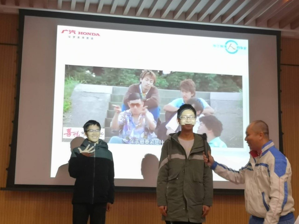 首先,主持人雷锐进行了开场致辞,介绍了“广汽本田·道路安全高校联盟”的由来,本次讲座正式拉开序幕。连续两年获得广汽本田汽车有限公司优秀讲师称号的何琳峰老师首先进行了授课。何老师从驾驶姿势、驾驶盲点以及安全带的注意事项等方面,通过视频、图文以及现场小游戏互动等寓教于乐的形式,让同学们在轻松活跃的氛围中学到安全驾驶的相关知识。在讲解驾驶姿势时,何老师给同学们展示了驾驶姿势的示意图,从头、肩、腰各方面为同学们进行了详细讲解。在驾驶盲点的讲解时,何老师邀请两位同学上台,通过游戏互动的形式让同学们切身感受到盲点的含义,精彩的游戏环节赢得在场同学们的阵阵掌声。