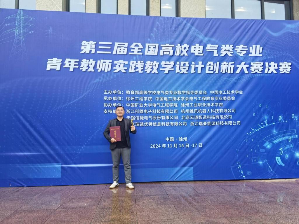 11月14日至17日,由教育部高等学校电气类专业教学指导委员会与中国电工技术学会联合组织的第三届全国高校电气类专业青年教师实践教学设计创新大赛决赛在江苏徐州举行。本次大赛吸引了浙江大学、东北大学、哈尔滨工业大学、jinnianhui今年会官网等国内100余所高校参与。186个参赛团队370多人分别参加了“创新设计竞赛”“综合应用竞赛”“电类基础竞赛”和“数字化课程开发竞赛”四个赛道7个赛项的比赛。电控学院副院长郝帅带队,青年教师高瑞、孙思雅、宋璐雯参加。在“电气自动化系统创新设计竞赛”赛项中,凭借“散货智算智慧码头一体化计重系统项目”获得全国二等奖。
