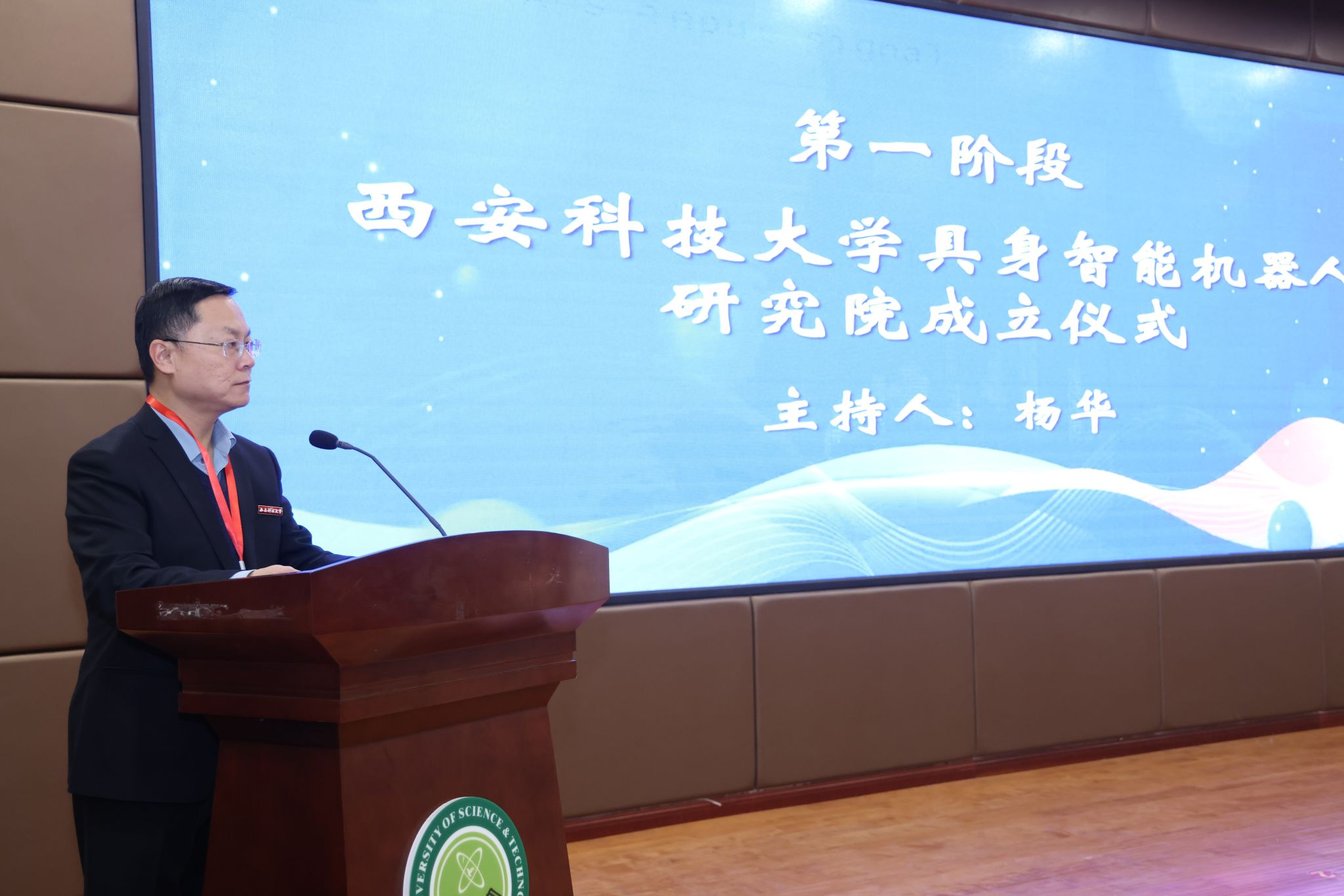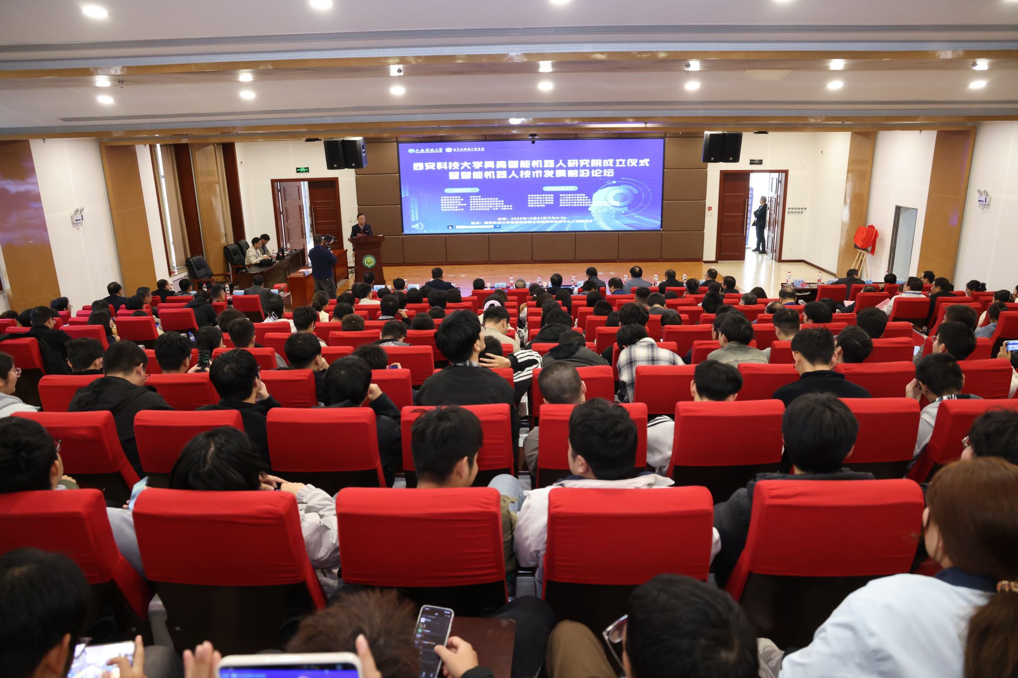 10月31日下午,jinnianhui今年会官网具身智能机器人研究院成立揭牌仪式暨智能机器人技术发展前沿论坛,在今年会官网临潼校区骊山校园煤炭科技中心二楼报告厅举行。中国自动化学会具身智能专业委员会副理事长、西安交通大学人工智能学院副院长孙宏滨教授、陕西省自动化学会副理事长、秘书长、西安交通大学自动控制研究所所长曹建福教授、陕西省煤炭学会常务副理事长惠维渊、秘书处干事薛煜亮、陕西省汽车工程学会常务副理事长、陕西汽车集团有限责任公司科技管理部部长刘大鹏、智能感知与图像理解教育部重点实验室副主任、西安电子科技大学人工智能学院执行院长侯彪教授、工信部新能源与智能网联汽车专家、长安大学汽车学院韩毅教授、苏州汇川技术有限公司校企合作西部总经理赵凯、陕西重构智信科技有限公司董事长兼总经理张西京、北京具能创智科技有限公司西北大区总经理刘红艳、北京中科慧灵机器人技术有限公司市场总监尹浩、睿尔曼智能科技(北京)有限公司经理张雨晗等应邀出席,今年会官网副校长文虎,科技处、对外联络与合作处等职能部门以及安全科学与工程学院、人工智能与计算机学院、机械工程学院负责人以及相关学院师生共计300余人参加。揭牌仪式及前沿论坛由jinnianhui今年会官网党委书记杨华及院长寇发荣主持。
