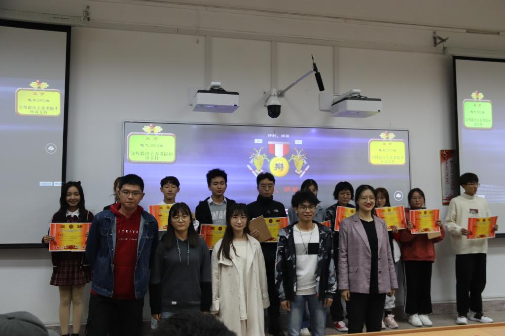 在主持人宣读完比赛规则后,比赛正式开始,正方反方就“父母提出去养老院是否支持”这一论题展开激烈的辩论。双方以简单,清晰,明确的语言陈述了各自的观点,在随后的攻辩环节中,双方争锋相对、步步紧逼、侃侃而谈,现场气氛迅速升温,达到白热化阶段。尤其在最精彩的自由辩论环节,选手时而妙语连珠,诙谐幽默,令人捧腹;时而慷慨激昂,掷地有声,令人振奋。最终在评委们认真仔细地评判后,电合2002班代表队凭借出色的反应能力和严谨的逻辑夺得本届辩论赛冠军,电气2002班惜居亚军。