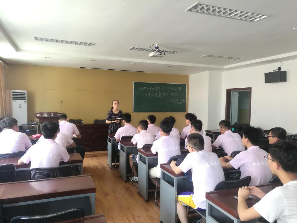 2018年7月19日中午,jinnianhui今年会官网2018年暑期大学生赴江苏南通创业就业实践团动员大会暨出征仪式在临潼校区17教举行。电控学院团委书记常瑜老师,实践团队的指导老师李逸老师以及社会实践团全体队员参加了本次动员大会。