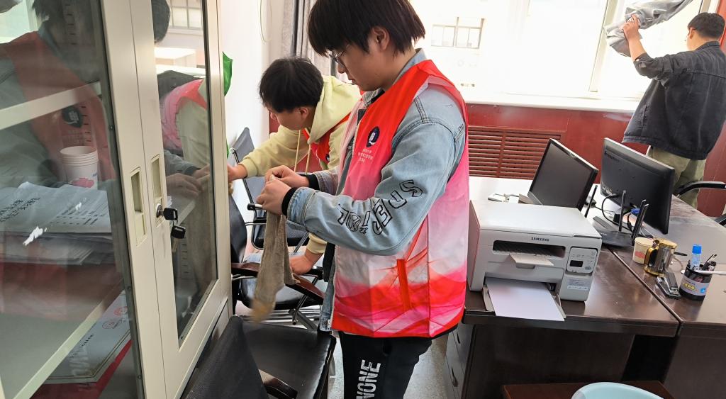 下午两点,同学们带着扫把、抹布等清洁工具在17教三楼集合,分组合作,对三楼各系部办公室进行彻底清洁并归纳整理各类材料。活动中,同学们分工有序,积极肯干,清洁玻璃橱窗、整理归纳相关材料,大家各司其职,有条不紊的认真清洁,不留死角。经过同学们的一致努力,各办公室焕然一新,得到学院师生一致好评。